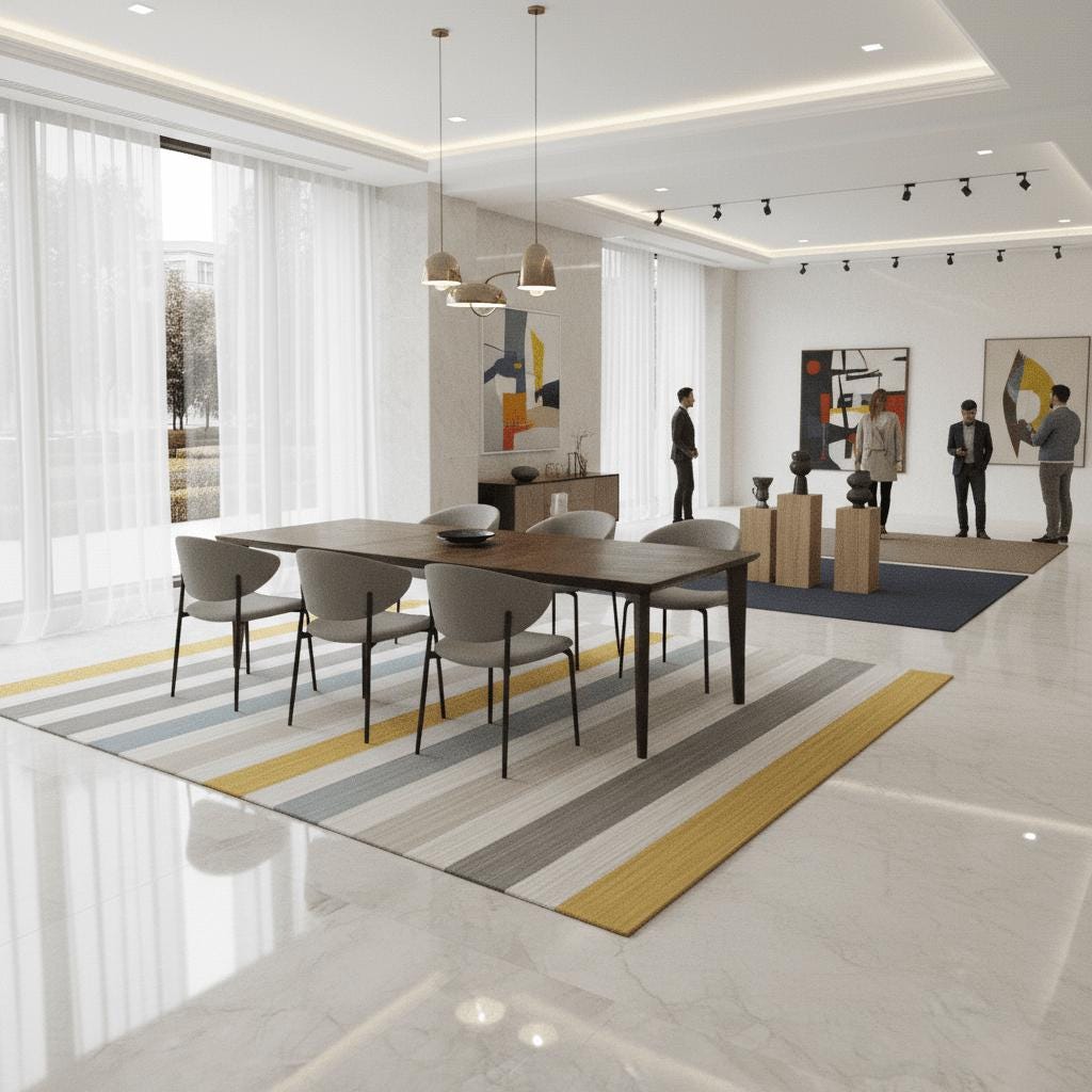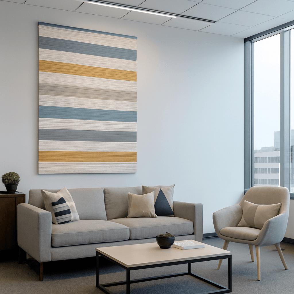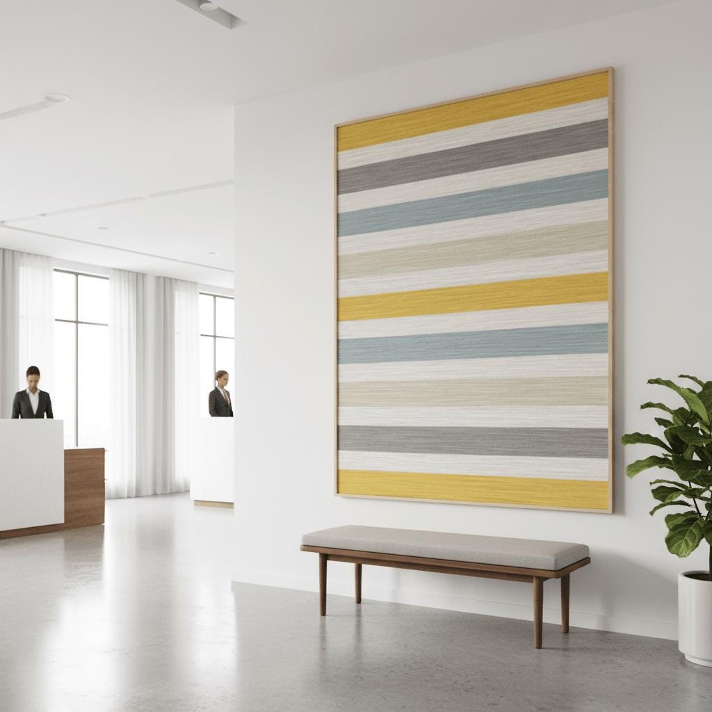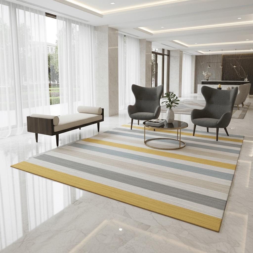 Design: Modern striped pattern with alternating bands in warm yellow, soft gray, light blue, and creamy ivory. Perfect for living rooms, bedrooms, hallways, or entryways.