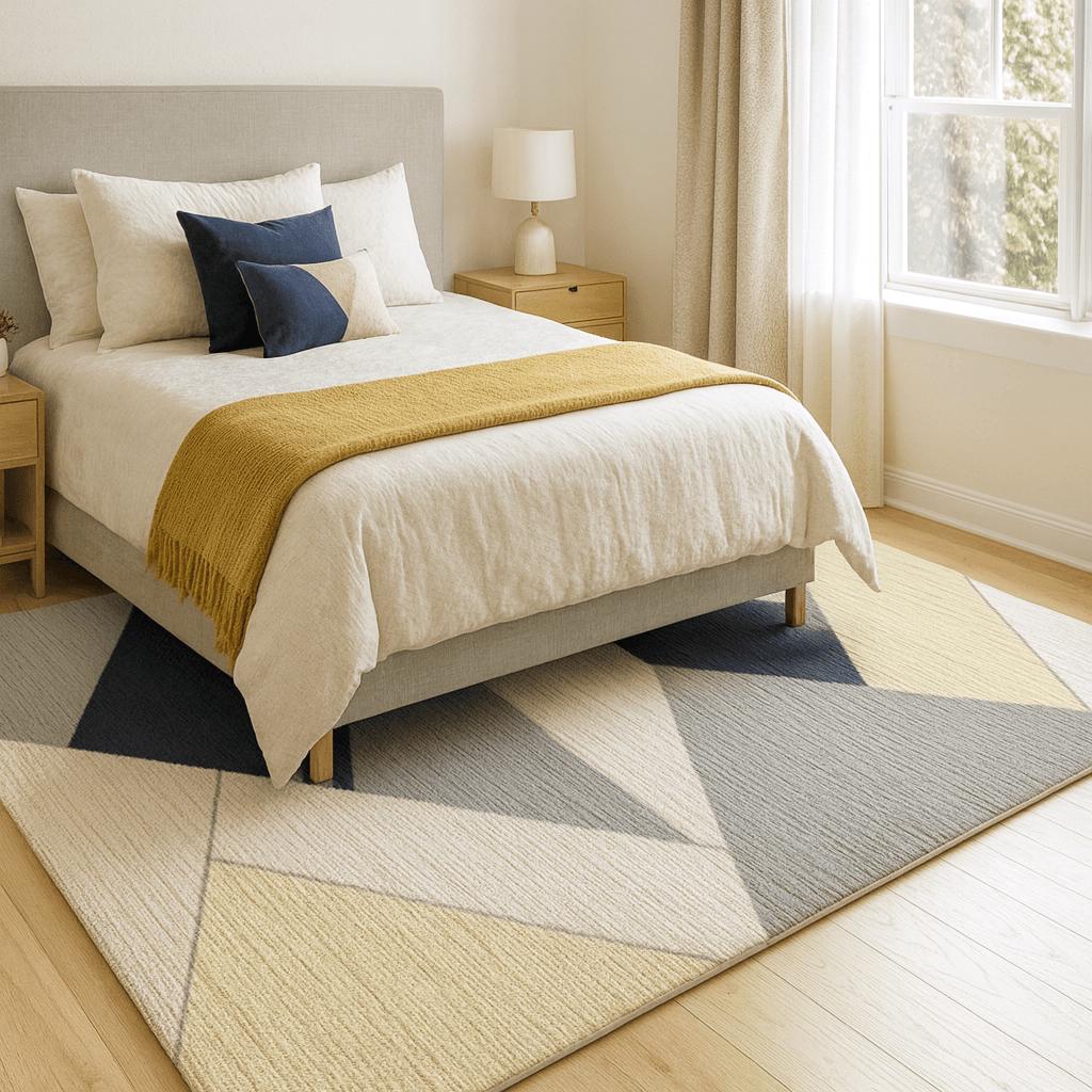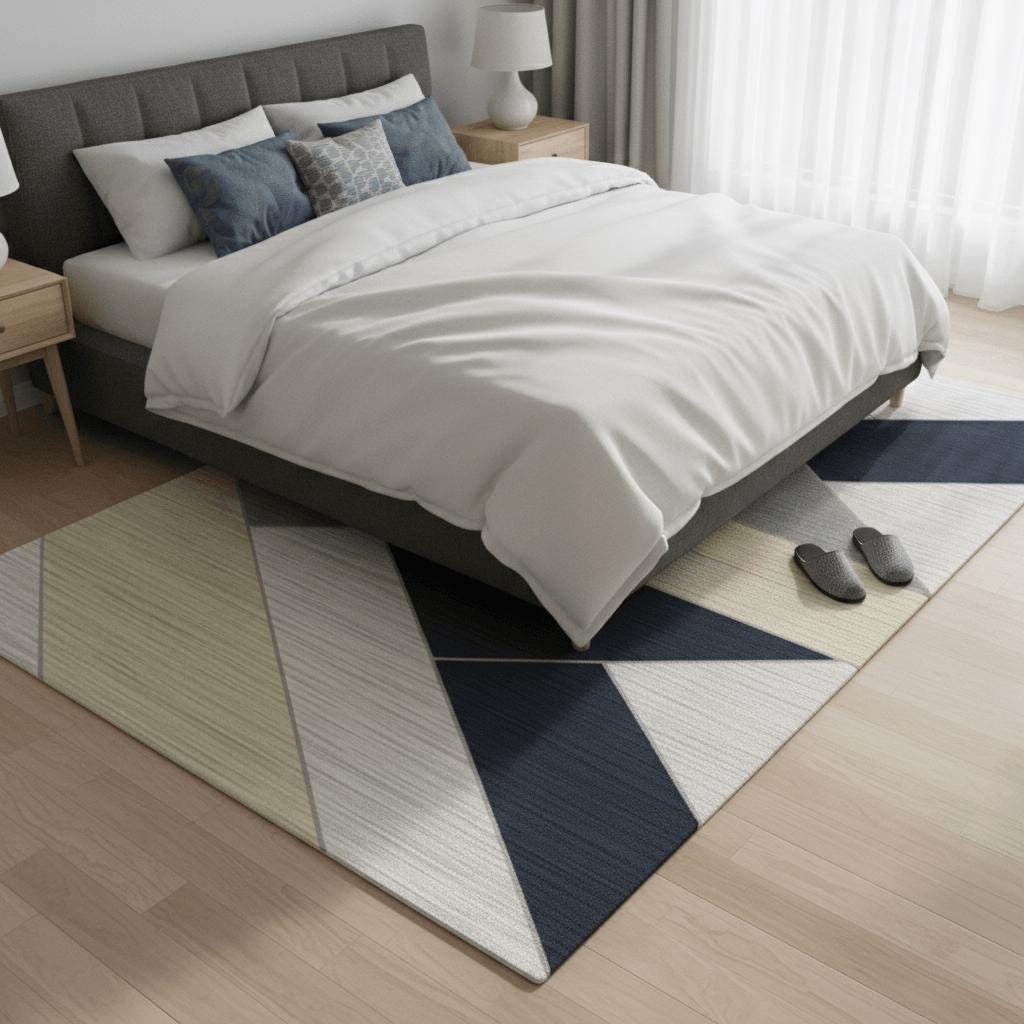 Discover the exquisite artistry of our Modern Geo Stripe rug, meticulously handcrafted by skilled artisans. Woven from a luxurious blend of premium wool and soft cotton, this rug offers both exceptional durability and a wonderfully soft underfoot feel. Its unique geometric design, featuring a sophisticated interplay of earthy neutrals, vibrant blues, and warm creams, brings a touch of modern artistry and bohemian charm to any room.