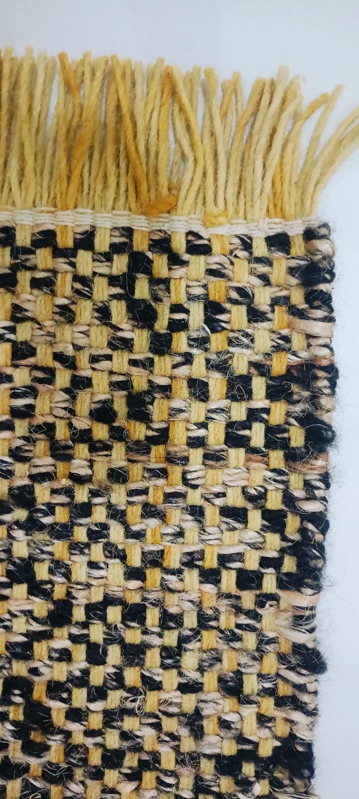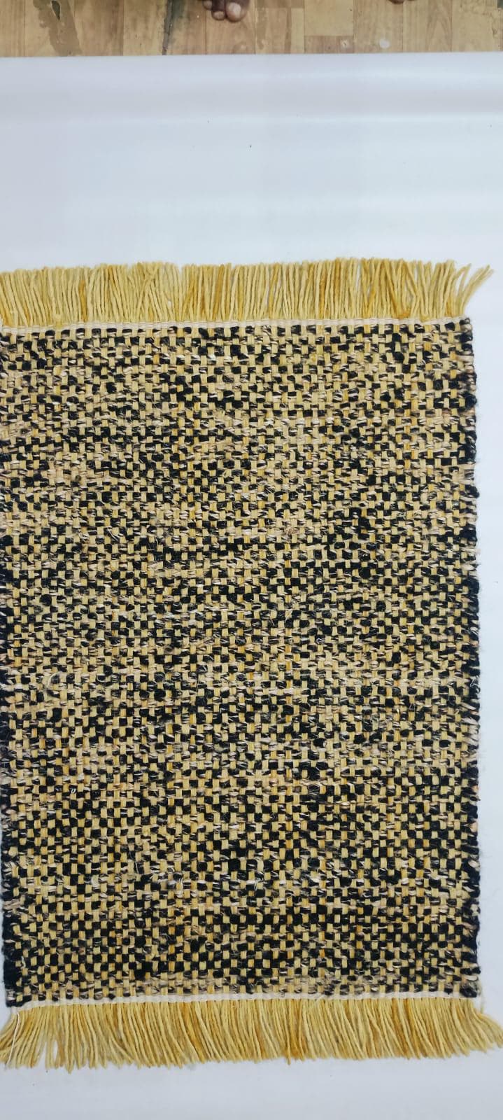 Discover the unique depth of our Rustic Black and Yellow Jute Rug. This exceptional piece is handwoven using a blend of natural yellow/tan and dark black/brown jute fibers, creating a multi-tonal, highly textured pattern. The resulting distressed, artisanal look adds a sophisticated bohemian or farmhouse touch to any setting.